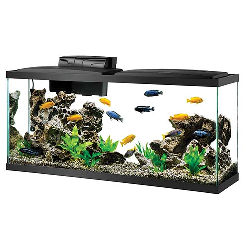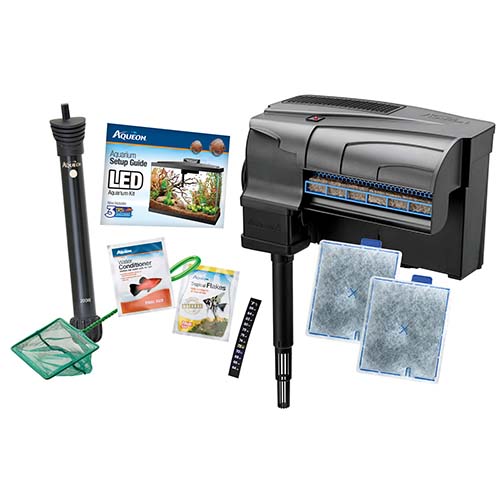 El kit incluye: acuario de vidrio, campana LED de bajo perfil, filtro de potencia QuietFlow, cartucho de filtro, calentador preestablecido sumergible, muestra de alimento para peces premium, muestra de acondicionador de agua, red para peces, termómetro y guía de configuración.