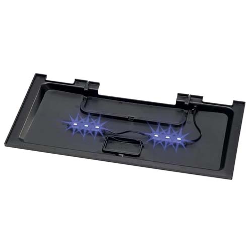 La campana de perfil bajo con luces LED de color azul muestra los colores brillantes dentro del acuario.