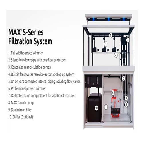 El MAX® S-System se suministra con la bomba del sistema principal, el skimmer de proteínas C-Skim 1800, los medios de filtración mecánicos y de carbón y todas las tuberías, incluida la preparación para conectar un enfriador y reactores auxiliares.